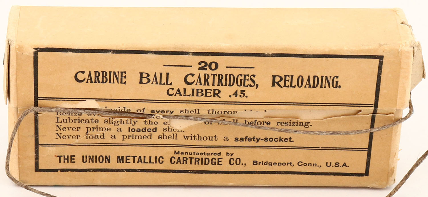 UMC, .45 Carbine Ball Cartridges, Reloading, 2pc, Full, buff box & label with black print, box is solid with light rub wear, light edge wear & light wear from bullets on bottom, ammo is excellent. Grade: Excellent ++ - Value: 30 to 90