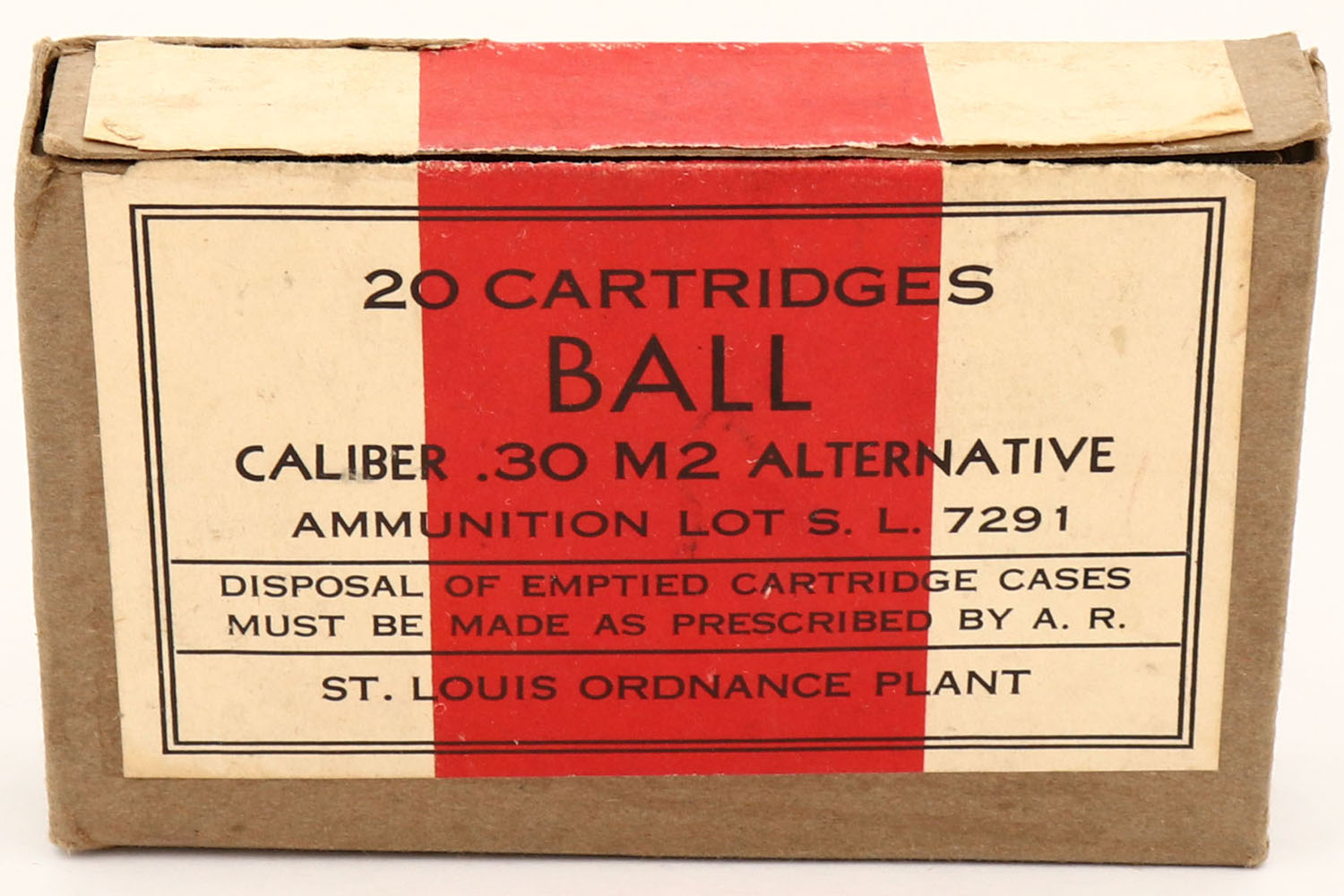 ST. Louis, .30 M2 Alternative, Lot S. L. 7291, 1pc, Full, buff box with buff/red label & black print, box is solid with age soiling, rub marks & edge wear, ammo is very good. Grade: Excellent - Value: 20 to 40