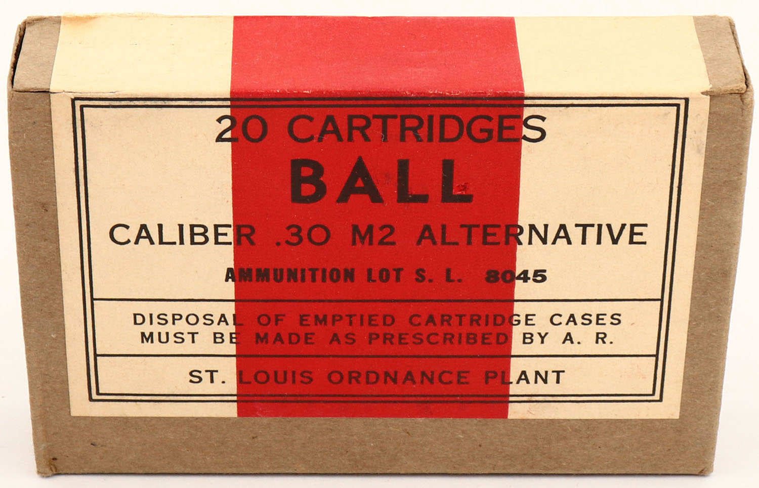 ST. Louis, .30 M2 Alternative Ball, Lot S. L. 8045, 1pc, FULL & SEALED, buff box with buff/red label & black print, box is solid with light rub wear. Grade: Excellent ++ - Value: 20 to 40