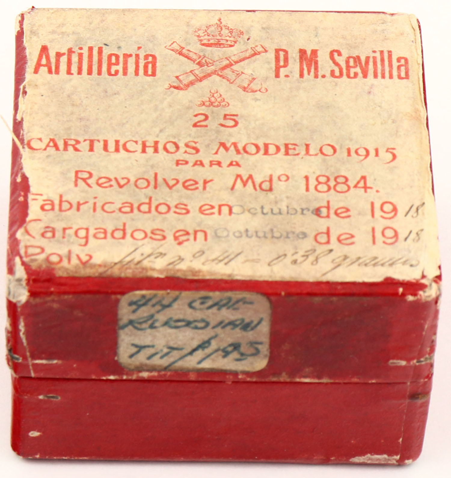 Spanish, 10.6mm Spanish Ordnance, 2pc, Full, red box with buff label & red/black print, box is solid with light age soiling, sticker, light rub marks & light edge wear, ammo is very good. (1570) Grade: Excellent - Value: 10 to 50