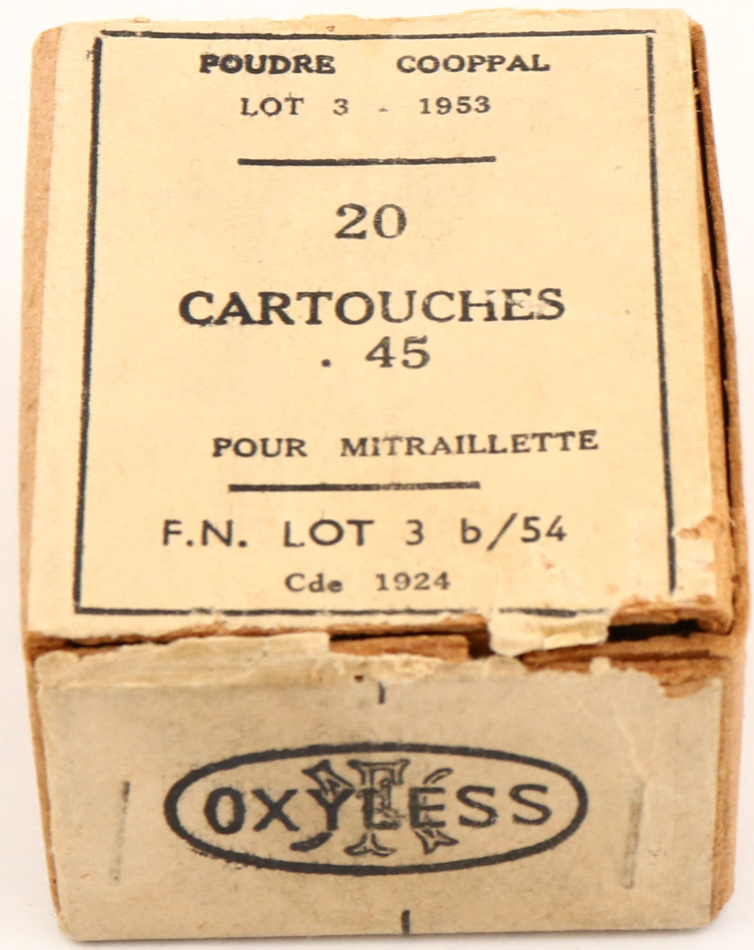 Oxyless, .45, 1pc, Full, buff box & label with black print, box is solid with light age soiling, light rub marks & light edge wear, ammo is excellent. (1482) Grade: Excellent - Value: 10 to 30