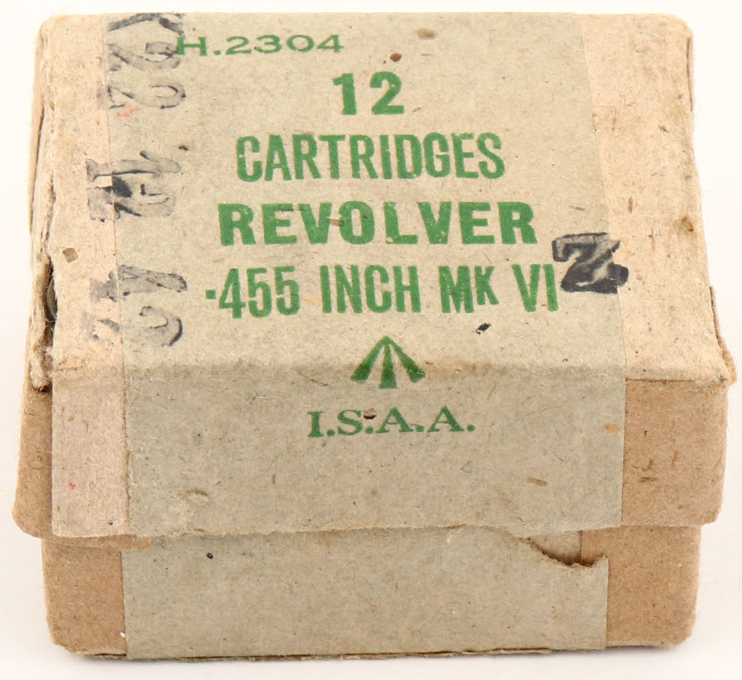 I.S.A.A., .455 Inch MK VI, 2pc, Full, buff box with gray label & green print, box has seam split on lid, light rub marks & light edge wear, ammo is excellent. (1507) Grade: Excellent - Value: 10 to 20