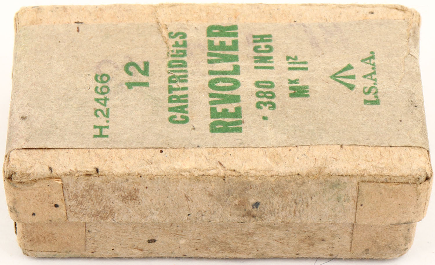I.S.A.A., .380 Inch MK II, 2pc, Full, buff box & label with green print, box is solid with split corner seam on lid, tear in box on lid, rub marks, edge wear & handling wear, ammo is very good. (978) Grade: Very Good ++ - Value: 10 to 30