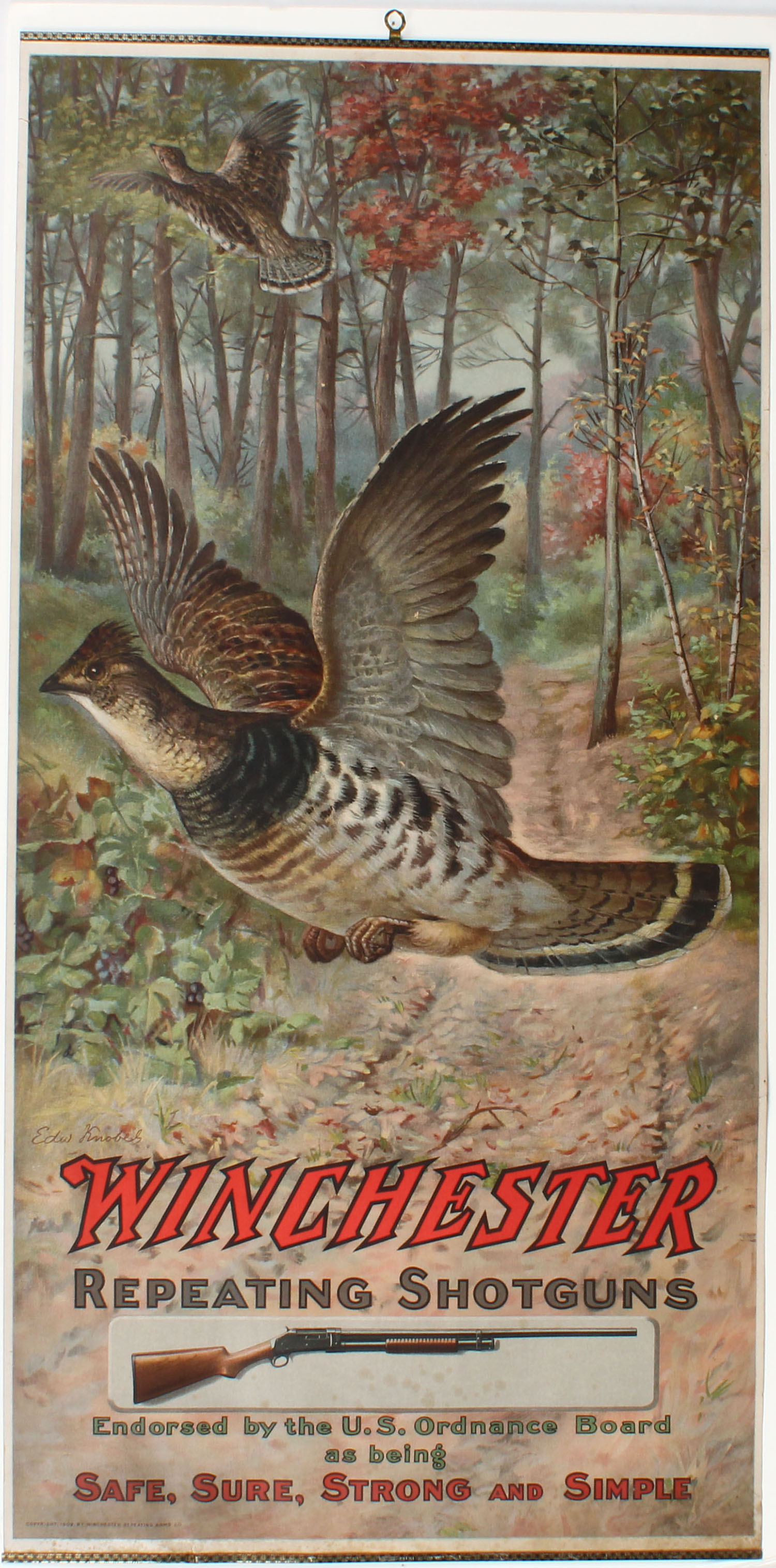 RARE Winchester Poster by Edw Knobes, dated 1909, has great fall colors of two grouse in flight, ''WINCHESTER REPEATING SHOTGUNS, ENDORSED BY THE U.S. ORDNANCE BOARD AS BEING SAFE-STRONG AND SIMPLE'', has brass bands top & bottom with brass hanger, wonderful all original condition, no edge wear or roll wrinkles, only the second one we have ever offered, great collector condition. Grade: Excellent + - Value: 6000 to 8000