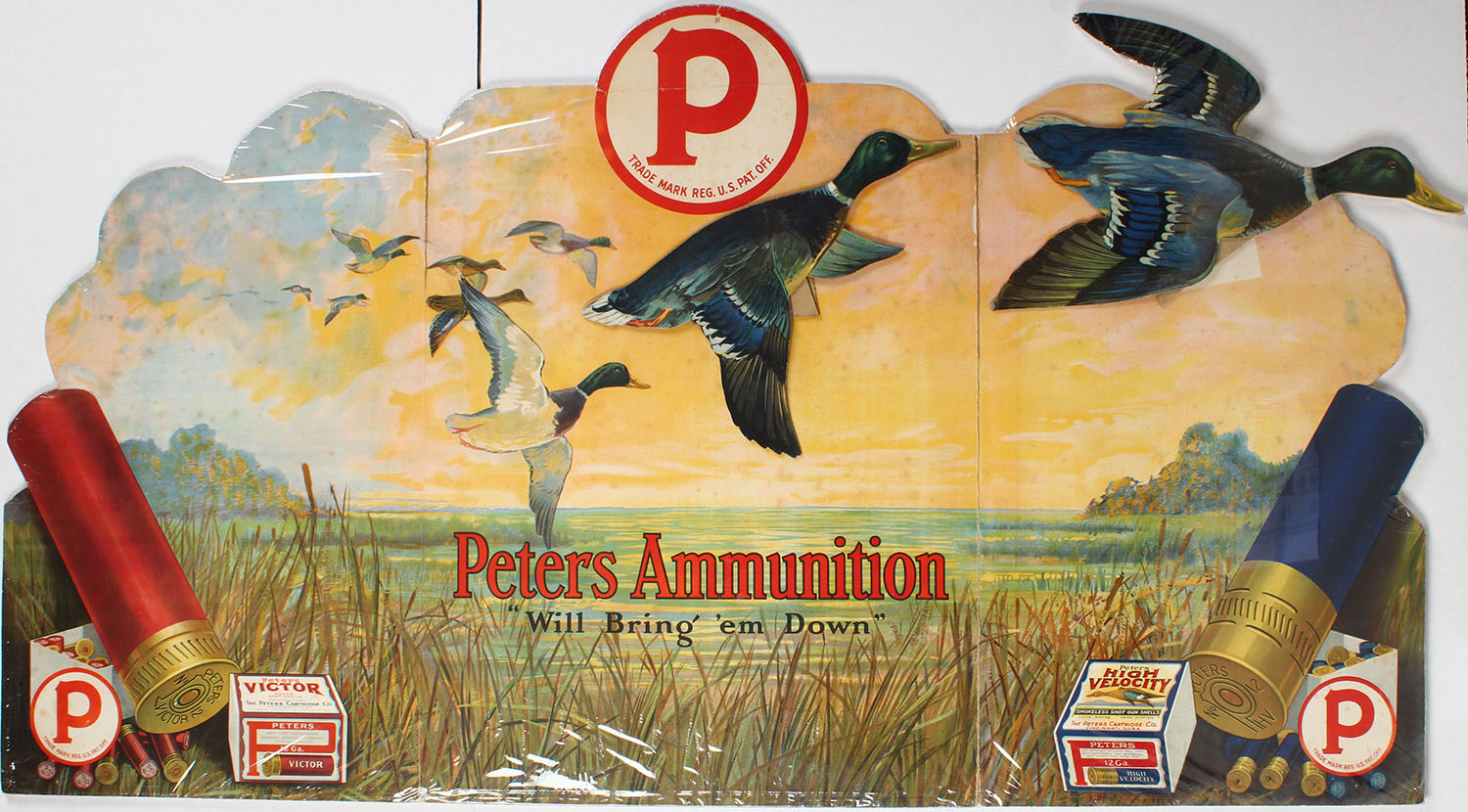 Exceedingly Rare Peters Diecut, Only one known! Pictures duck hunting scene with large 3D mallards flying over water & marsh grass, shows 2pc shotshell boxes & large shot shells, tri-fold, 52'' x 29'', ''PETERS AMMUNITION WILL BRING THEM DOWN'', has fantastic colors with one fold mark to top wing, the photo was taking in shrink wrap, so the glares to top left & bottom are just that glares. ONLY ONE KNOWN! Grade: Excellent - Value: 5000 to 10000