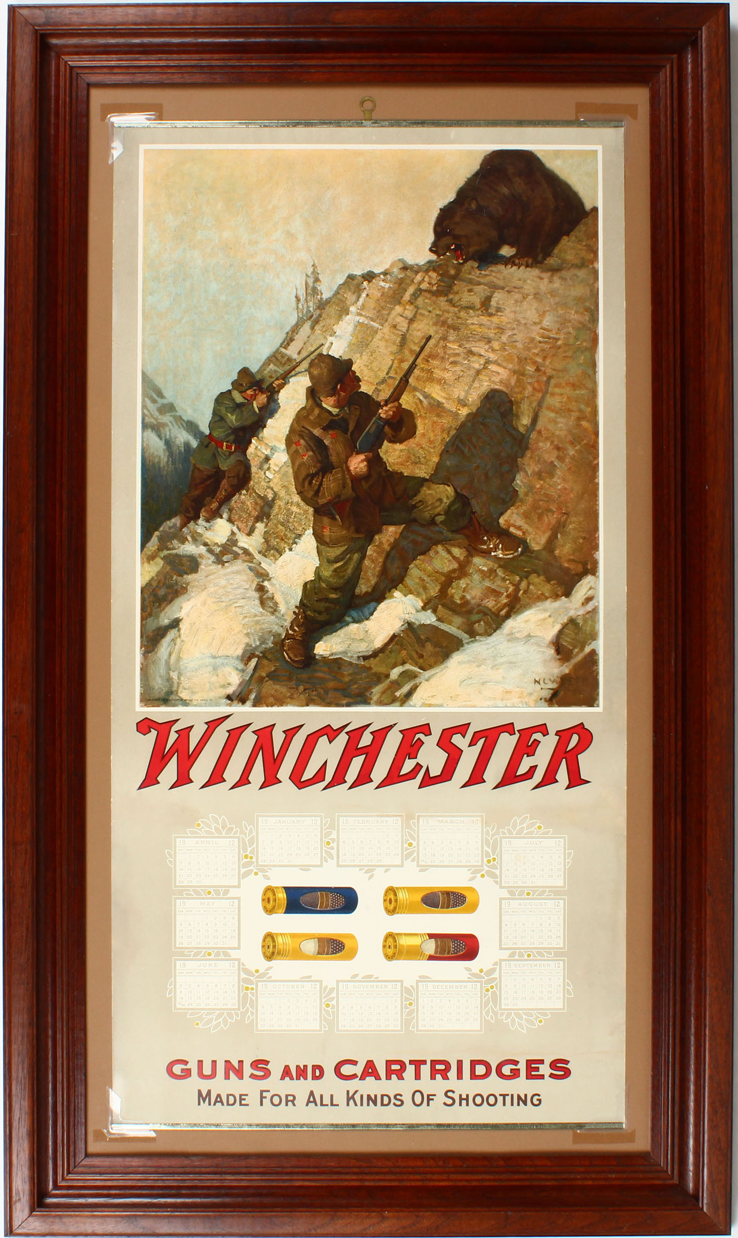 1912 Winchester Calendar by N.C. Wyeth, all 12 months are shown on this calendar around the color window shells, Dramatic full color image of two hunters on snow covered cliff with grizzly bear on the attack from above, has brass bands on top & bottom with brass hanger, has some professional touch ups to edges otherwise mint with fantastic colors, no page but look at the wonderful full color window shells in center, 15'' x 29 3/4'', Framed, VERY COLLECTIBLE! Grade: Excellent ++ - Value: 2500 to 5000