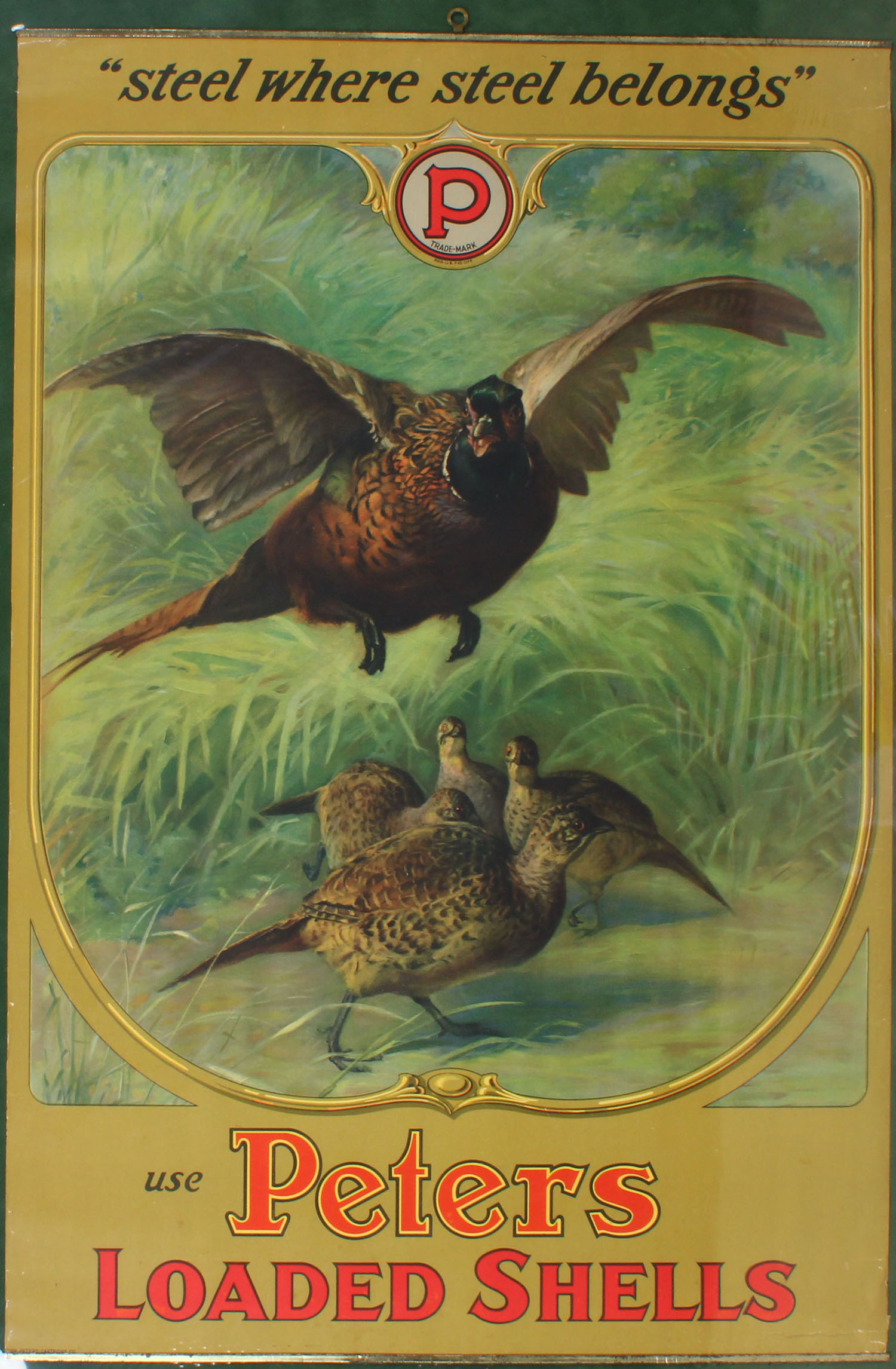 VERY RARE! Peters Cart. Co. Poster, ''STEEL WHERE STEEL BELONGS'' ''USE PETERS LOADED SHELLS'', possibly by G. Muss Arnolt, BANDS TOP & BOTTOM with both brass hangers, 20'' x 30 1/4'', wonderful image of roster pheasant in flight over covey of hens, has great color with slight edge wear in two places, all original, FIRST ONE WE HAVE OFFERED! Grade: Excellent ++ - Value: 2000 to 4000