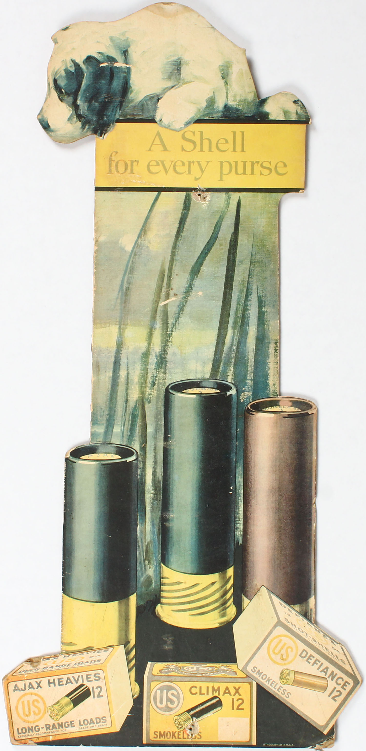 US Cart. Co. Diecut, pictures puppy on top & 3 2pc shotshell boxes with shells at bottom, shows fading & two tack holes, 13'' x 27''. Grade: Very Good - Value: 30 to 250