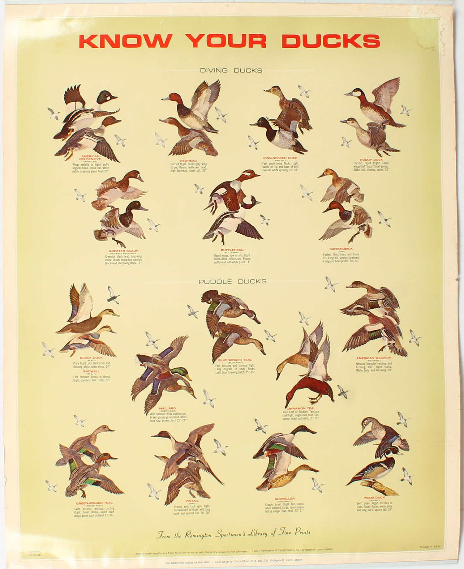 Large Remington Peters KNOW YOUR DUCKS poster, great colors, size 22'' x 29'', has bands top & bottom with brass hanger, one stain to top left. Grade: Excellent - Value: 30 to 150