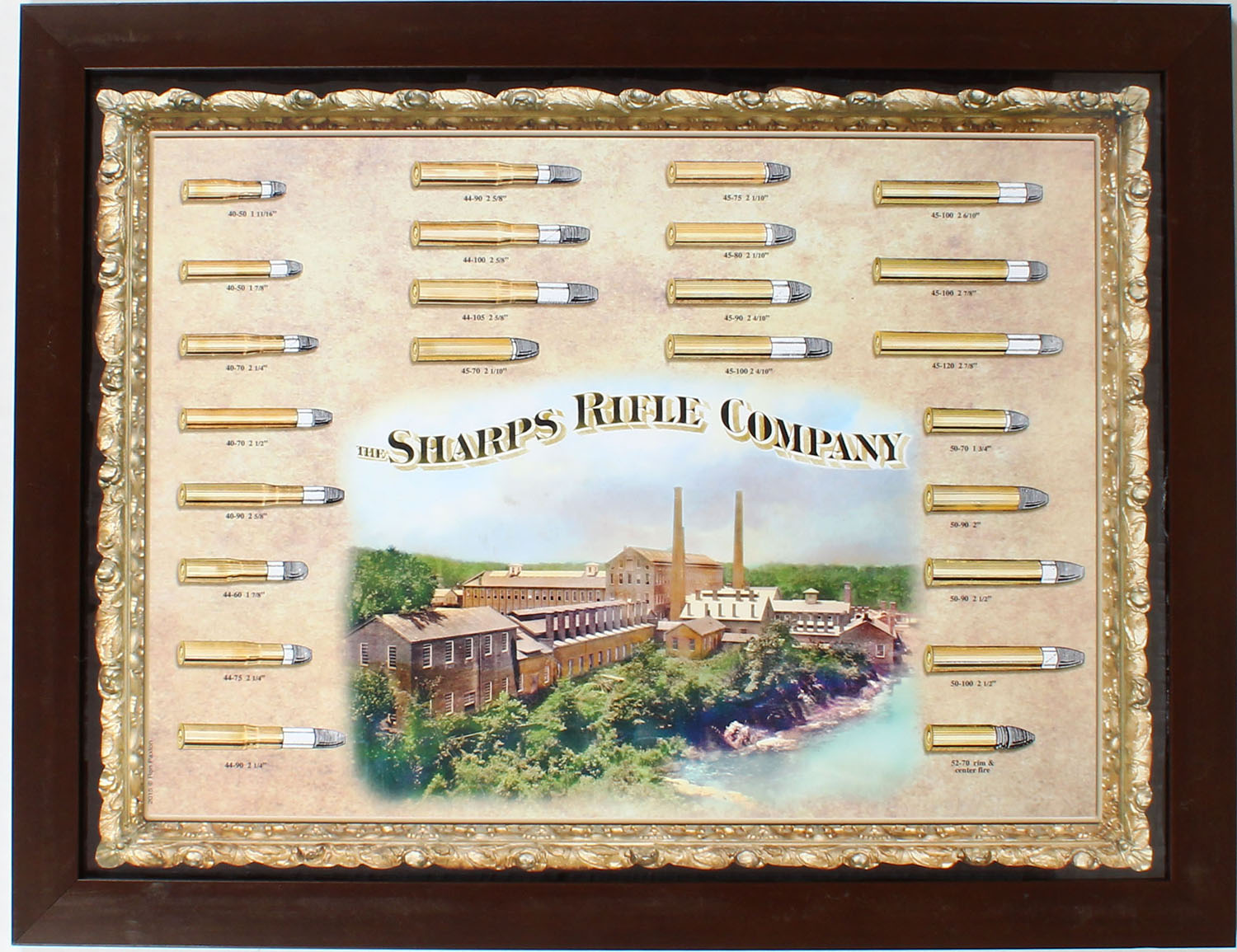 Sharps Rifle Co Poster, has beautiful colors of factory on rivers edge & many cartridges, framed. Grade: Excellent - Value: 20 to 250