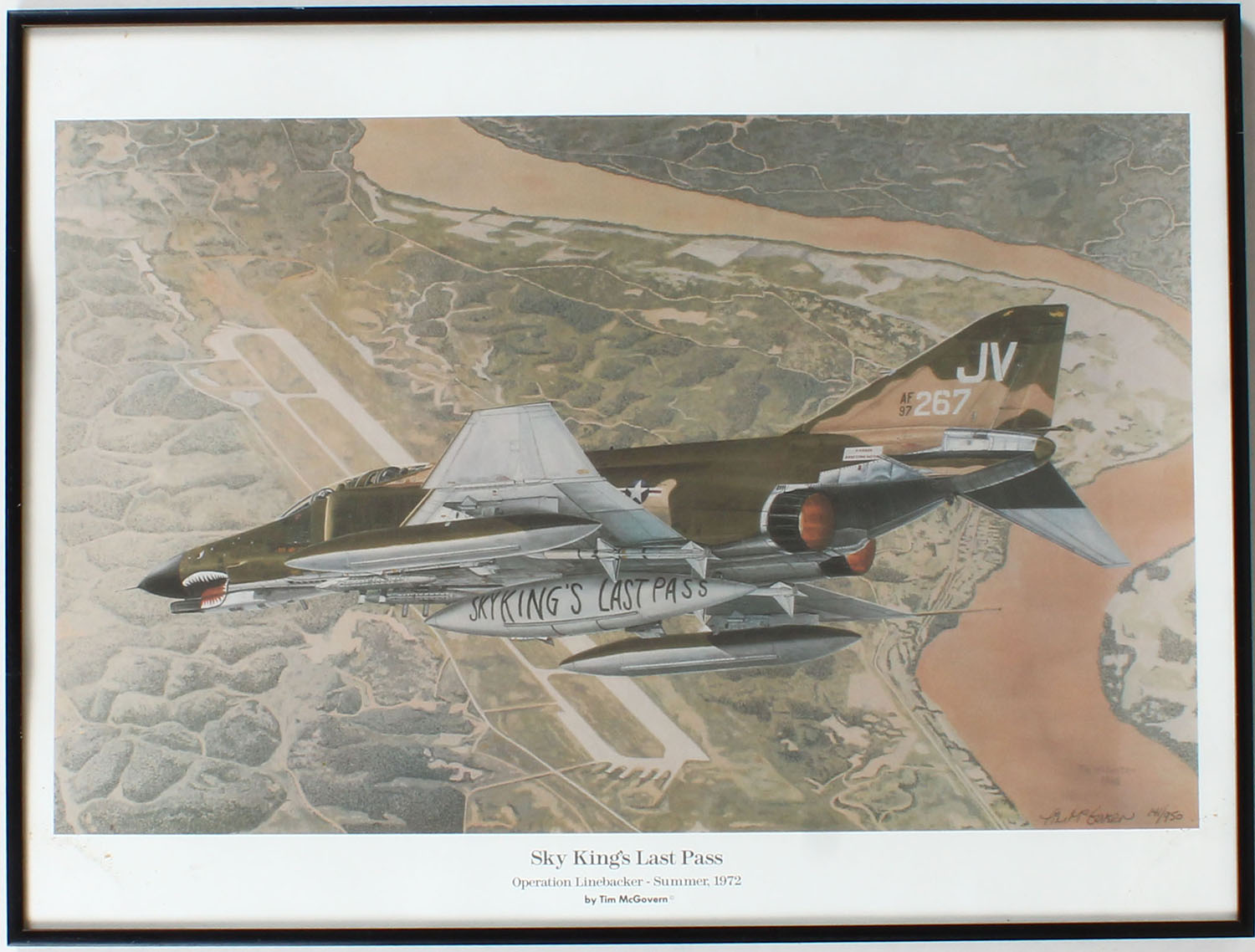 Sky King's Last Pass poster, by Tim McGovern pictures camo military plane in flight in Operation Linebacker, Summer 1972, framed, 22'' x 14'', 141/950. Grade: Excellent - Value: 10 to 60