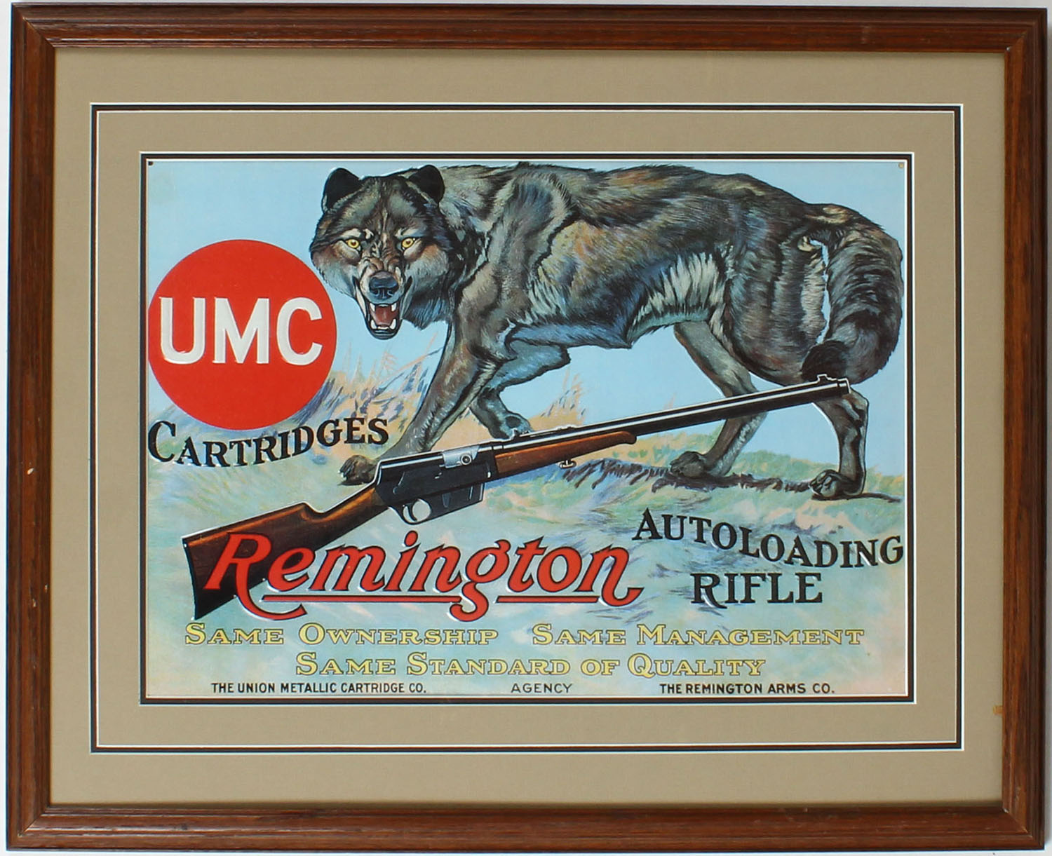 Rem UMC Autoloading rifle model metal sign, pictures wolf on attack, framed, 16'' x 11 1/2''. Grade: MINT - Value: 6 to 30