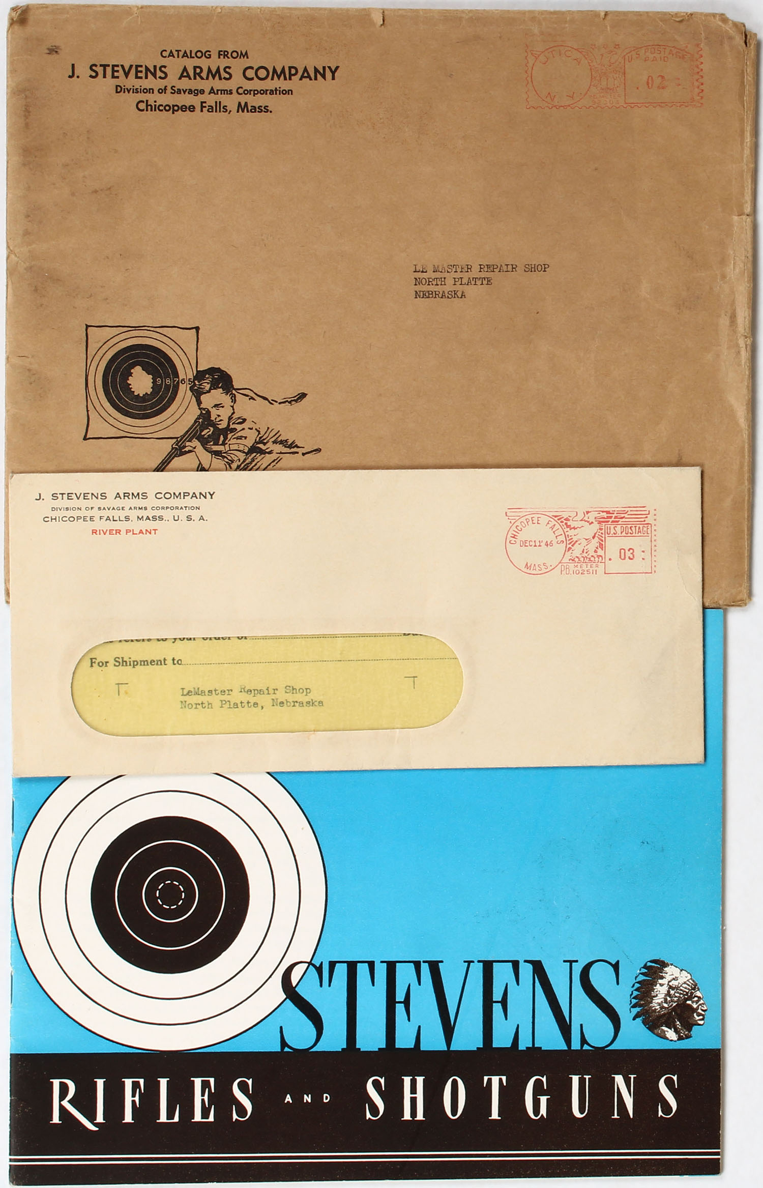 Stevens Rifles & Shotguns Catalog with mailing envelope plus regular envelope, many colored images of guns, 24 pages, 7 3/8'' x 9''. Grade: Excellent + - Value: 20 to 80