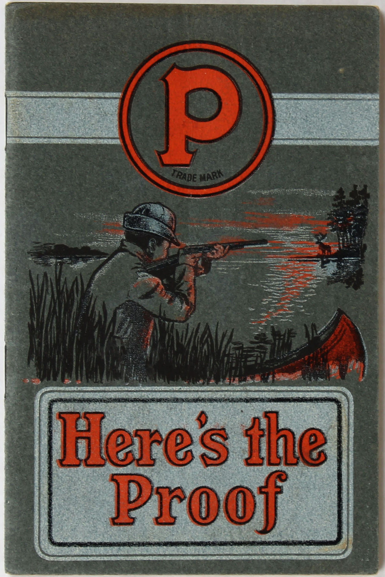 1912 Peters ammo catalog, Here's the Proof, lots of ammo pictured with ghost images of guns, 33 pages, 4 1/2'' x 7''. Grade: Excellent - Value: 40 to 150