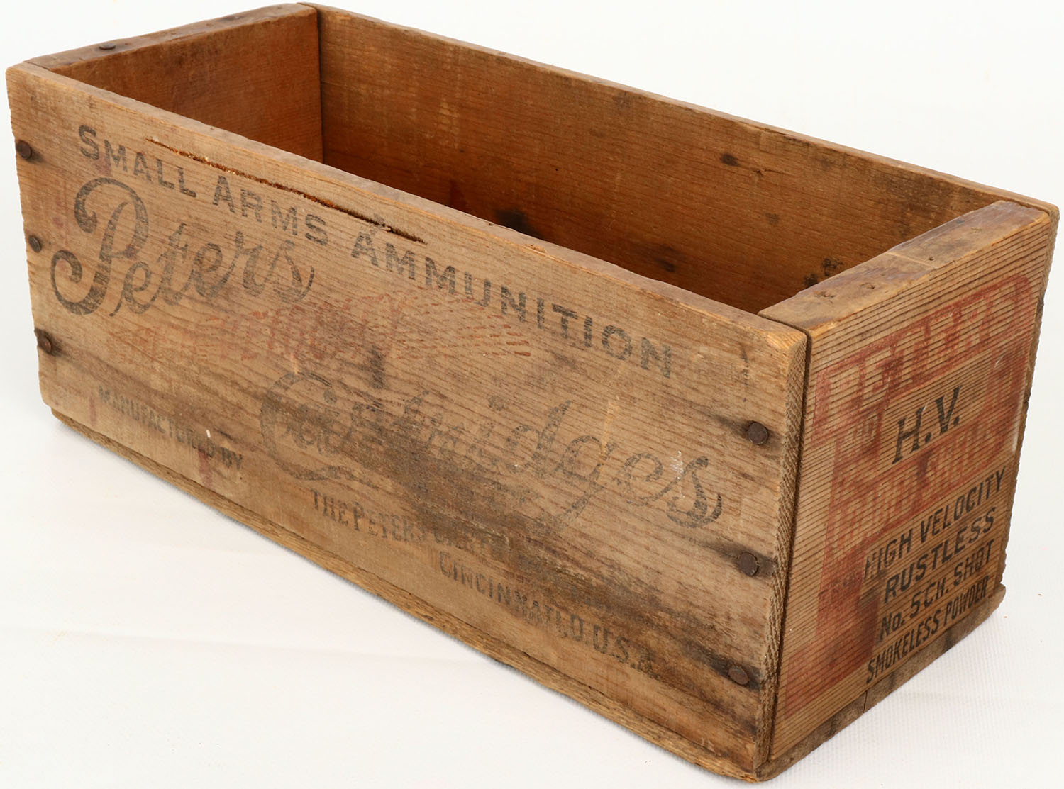 Peters High Velocity, 140 Ga., 5 ch., tongue and groove construction wood shipping crate, black & Red print is faded and the crate is solid. Grade: Very Good + - Value: 20 to 100