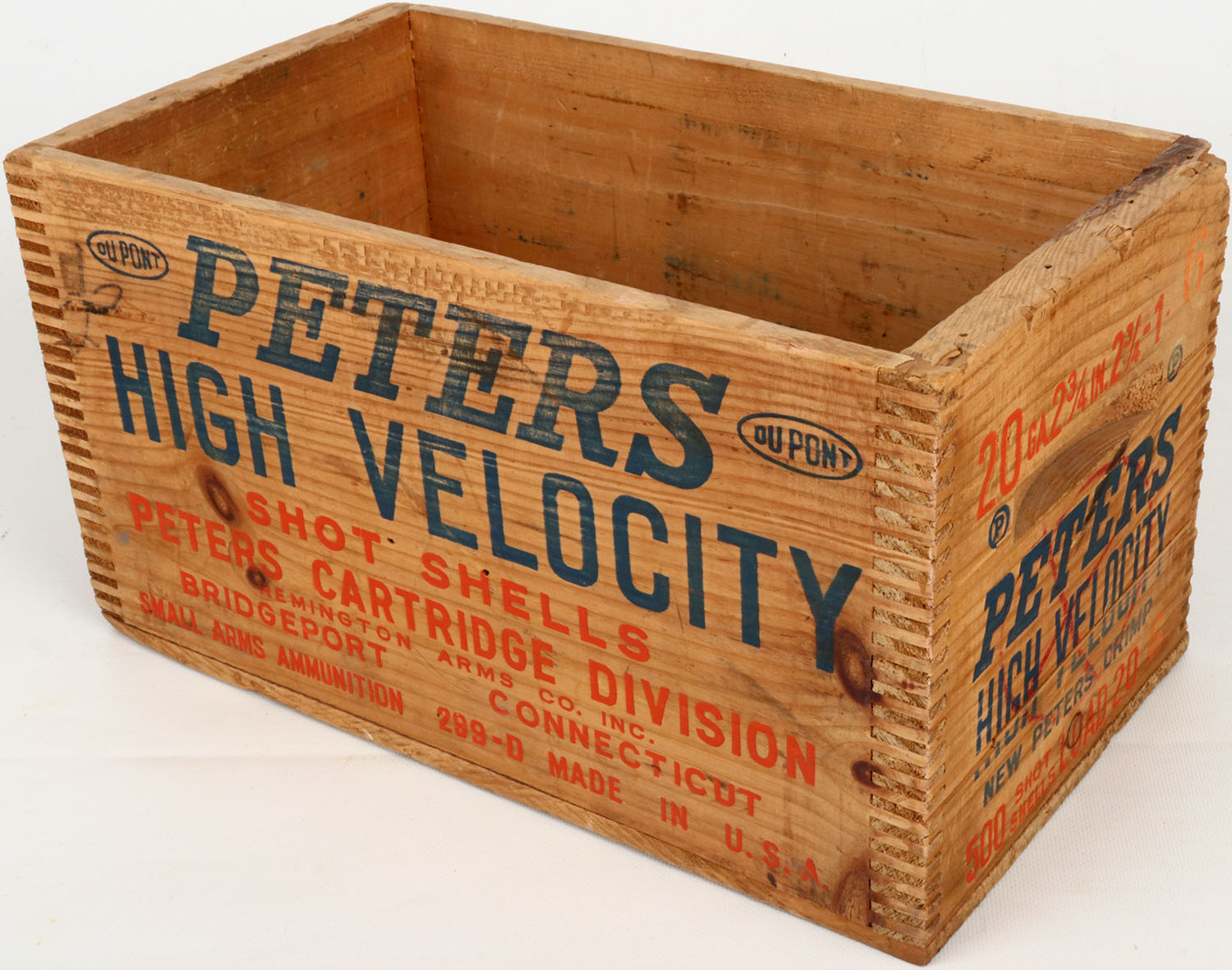 Peters High Velocity 20 ga., tongue and groove construction, orange & blue print is solid, crate is solid. Grade: Excellent - Value: 30 to 80
