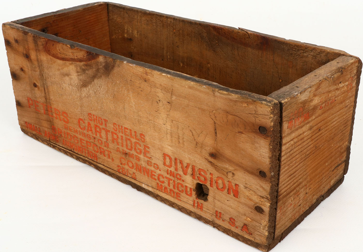 Peters High Velocity 410 ga., nail construction, orange & blue print is very faded, crate has age soiling. Grade: Good + - Value: 6 to 30