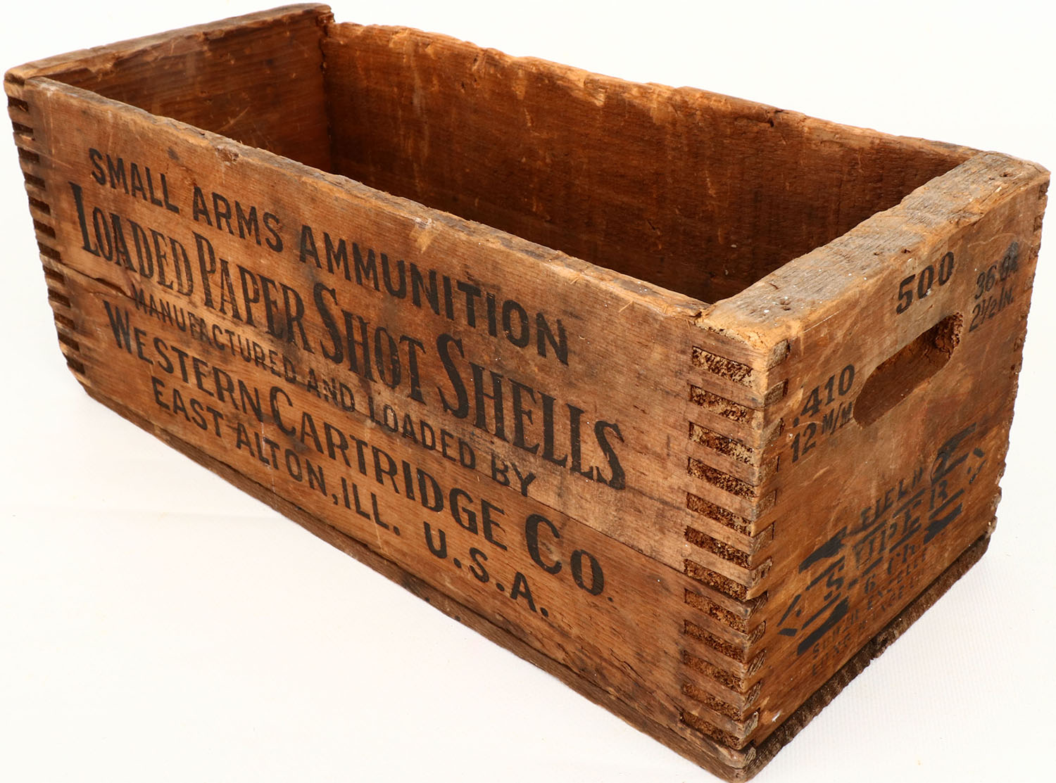 Western Super-X, 410 Ga., 2 1/2'', tongue & groove construction wood shipping crate, black & red print is faded, and the crate has some age soiling. Grade: Very Good - Value: 16 to 50