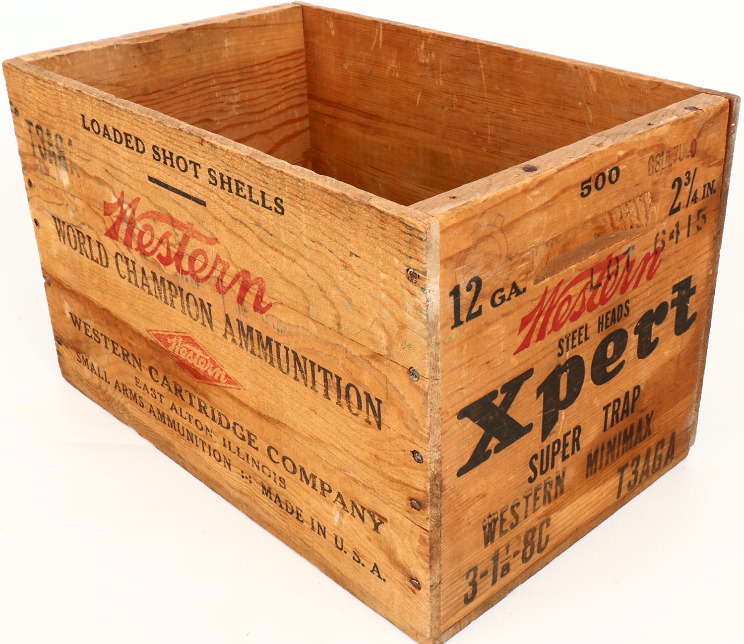 Western Xpert, 12 Ga., 2 3/4, 8 Ch., nail construction wood shipping crate, black & red print is solid on 2 sides, other 2 sides are blank, and the crate is solid. Grade: Very Good - Value: 10 to 40