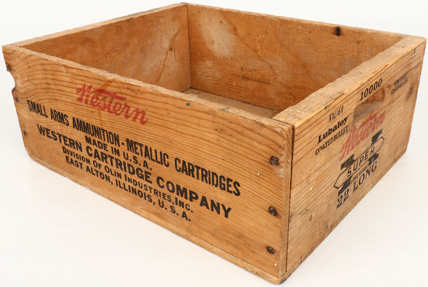 Western Super-X, .22 Long., nail construction wood shipping crate, black & red print is solid, and the crate is solid. Grade: Excellent - Value: 16 to 60