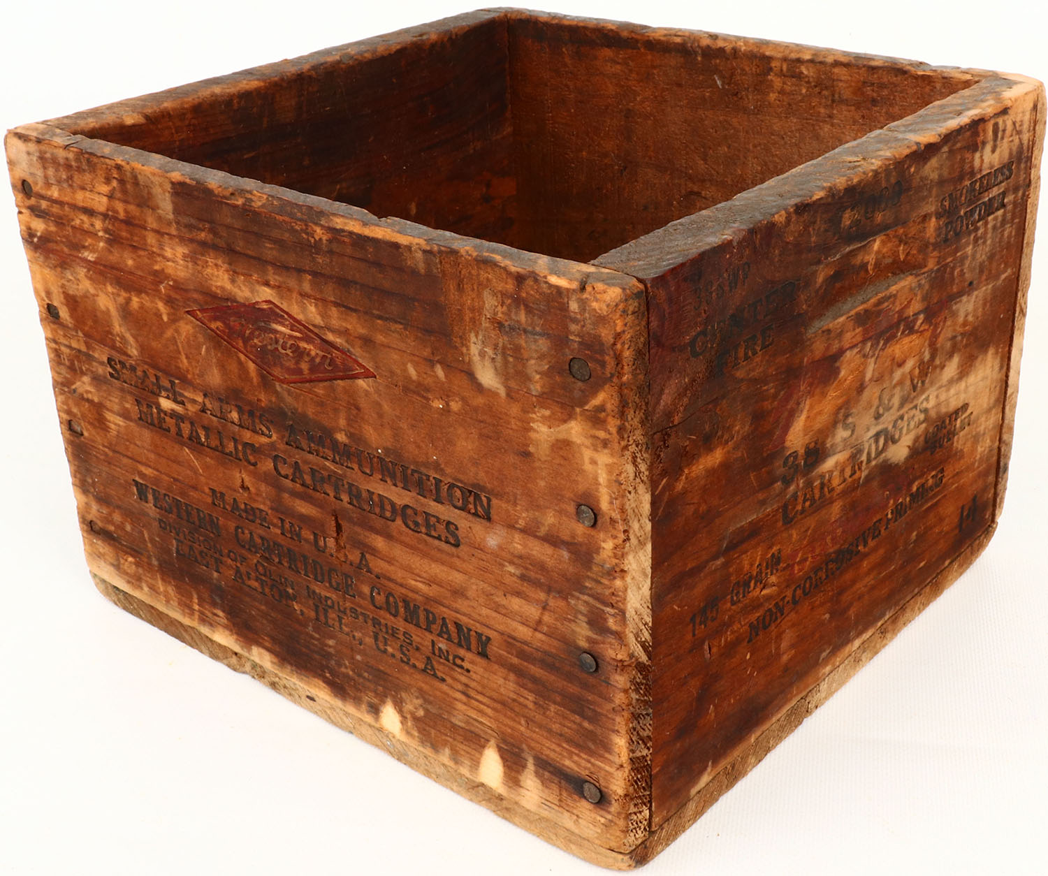 Western , 38 S&W., nail construction, red, & black print has heavy fading and age soiling. Grade: Very Good - Value: 2 to 60