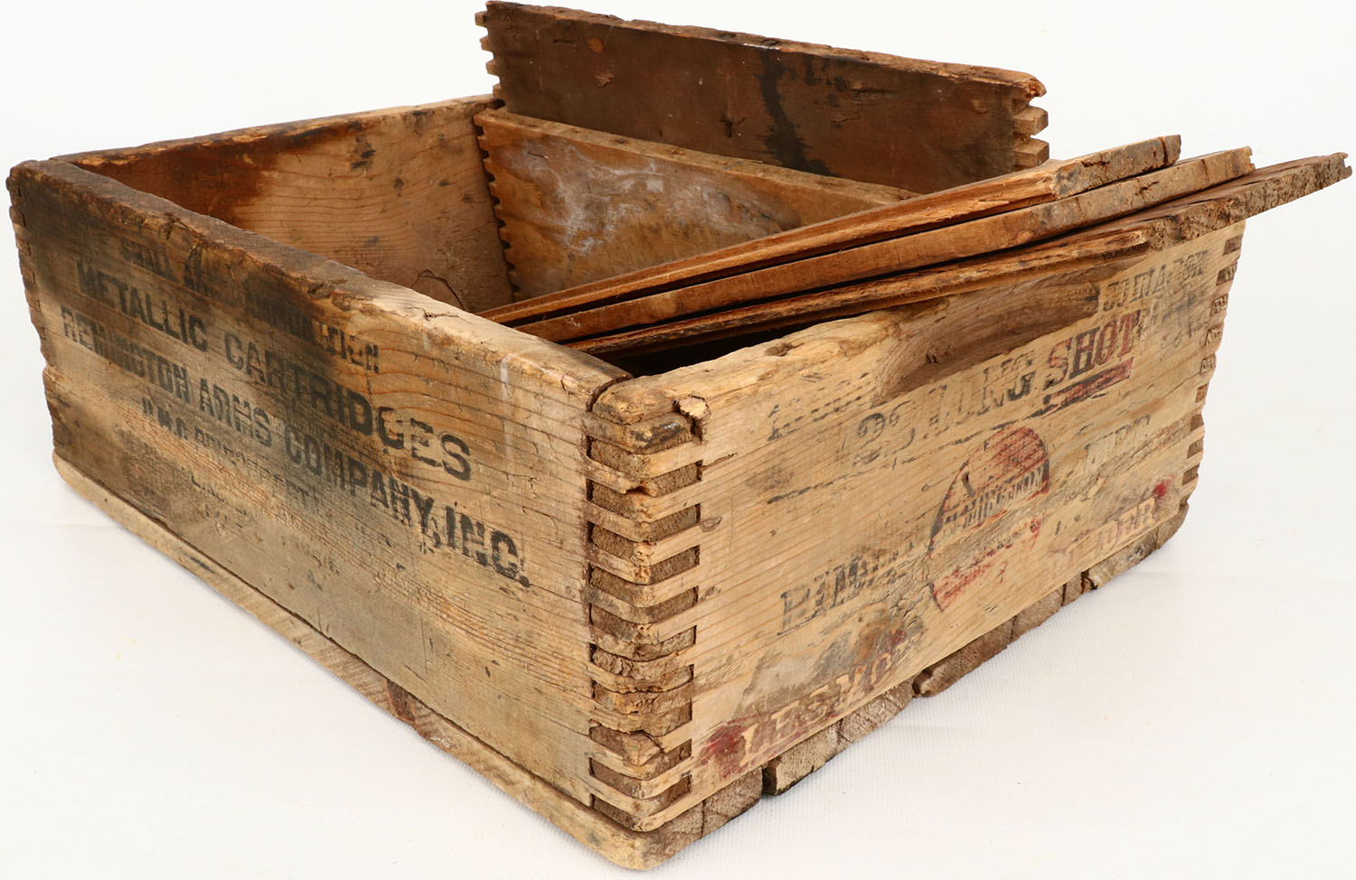 Remington UMC .22 Long Shot, tongue and groove construction wood shipping crate, black & red print faded and the crate has age soiling. Grade: Very Good - Value: 2 to 50