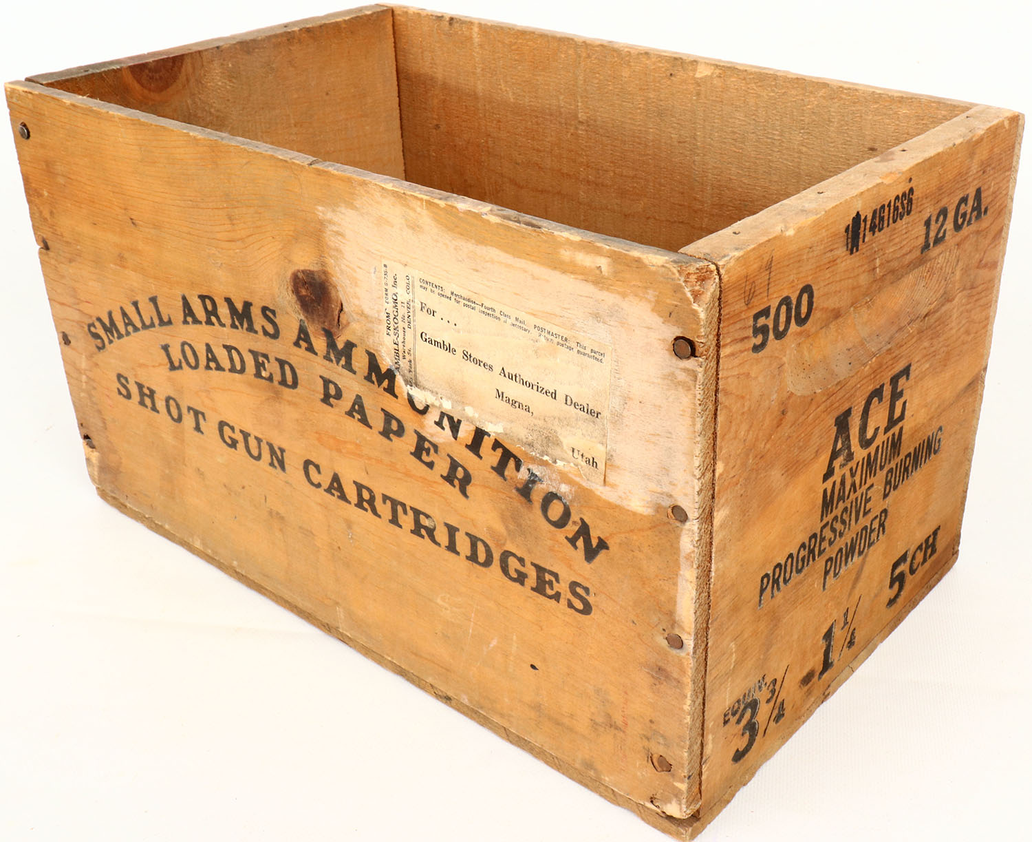 Small Arms Ace, wood shipping crate, 12 ga. 5 ch. shot., nail construction, black print is solid and crate is bright and clean. Grade: Excellent - Value: 10 to 50