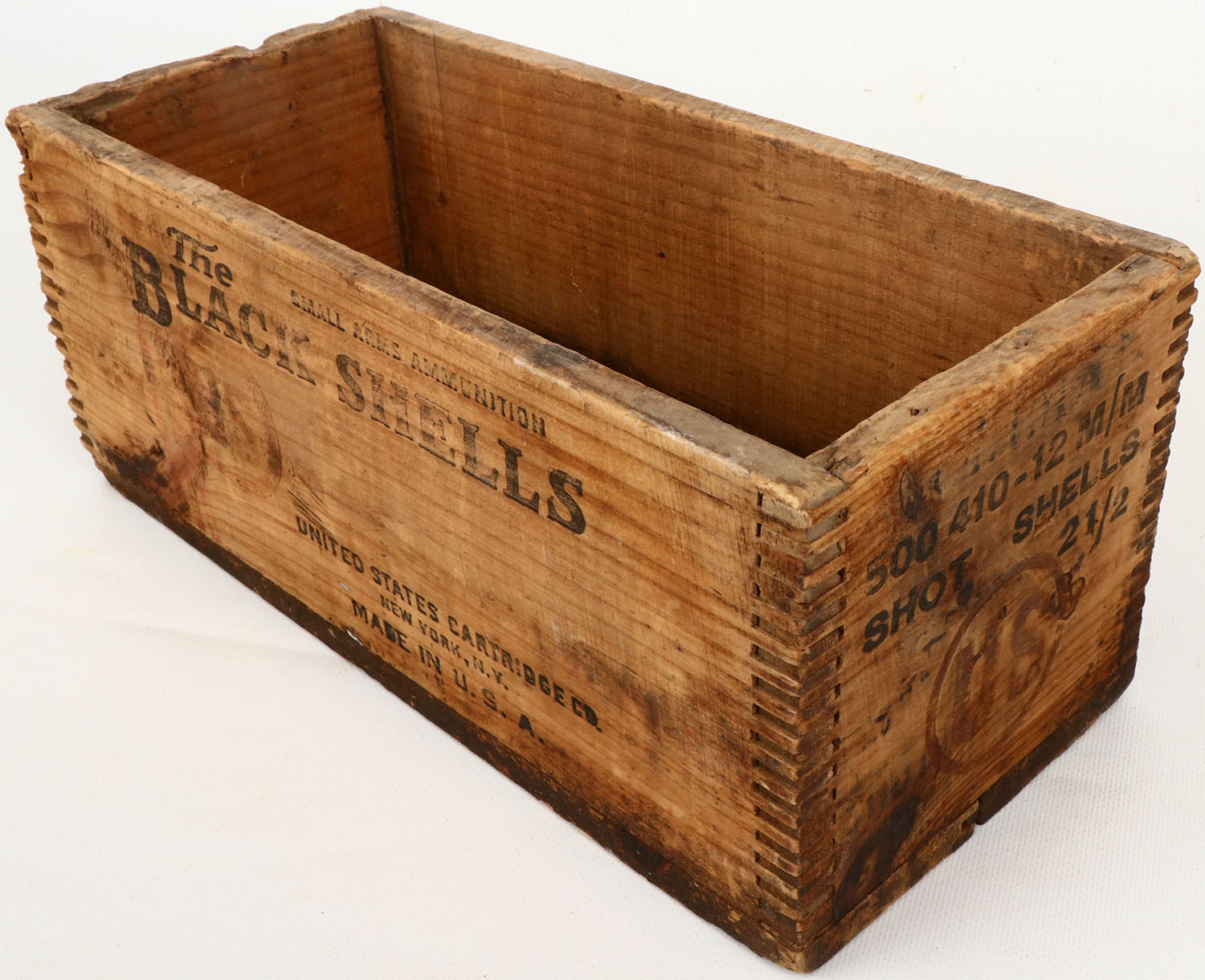 US The Black Shells, 410 ga., tongue and groove construction wood shipping crate, red & black print is faded, crate has age soiling. Grade: Very Good - Value: 16 to 60