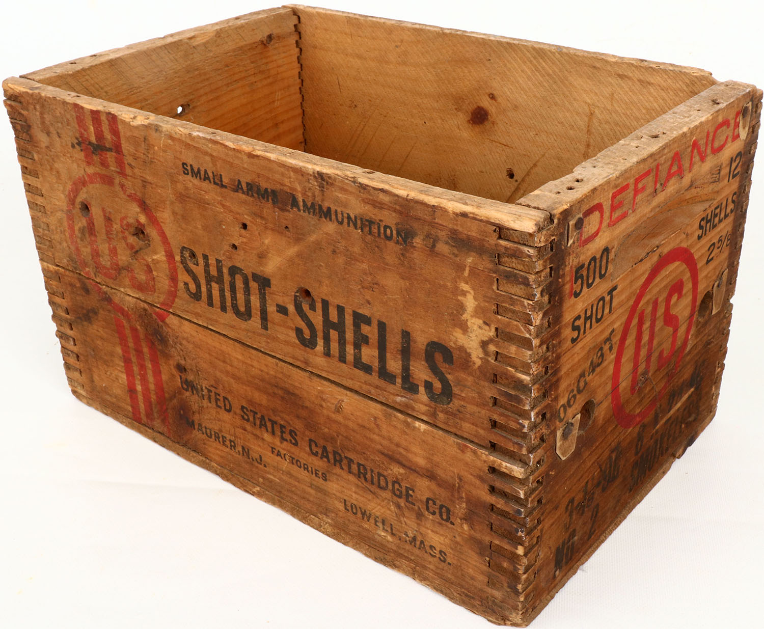 US Defiance, 12 ga., tongue and groove construction wood shipping crate, red & black print is solid, crate has age soiling. Grade: Very Good - Value: 10 to 50