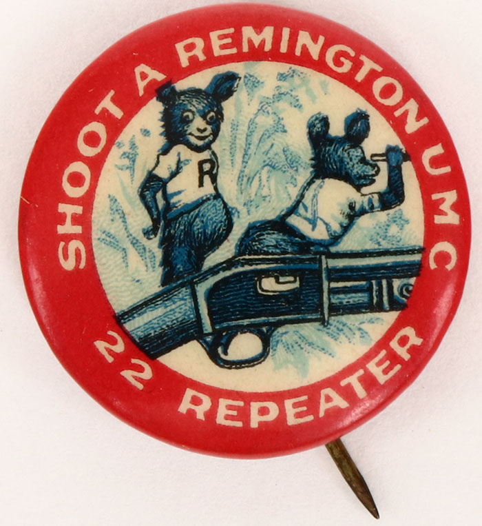 RARE! Remington pinback, pictures 2 bears with binoculars and a profile view of a rifle, Bastian Bros paperback is solid, pin is solid, bright and clean. Grade: Excellent ++ - Value: 100 to 300