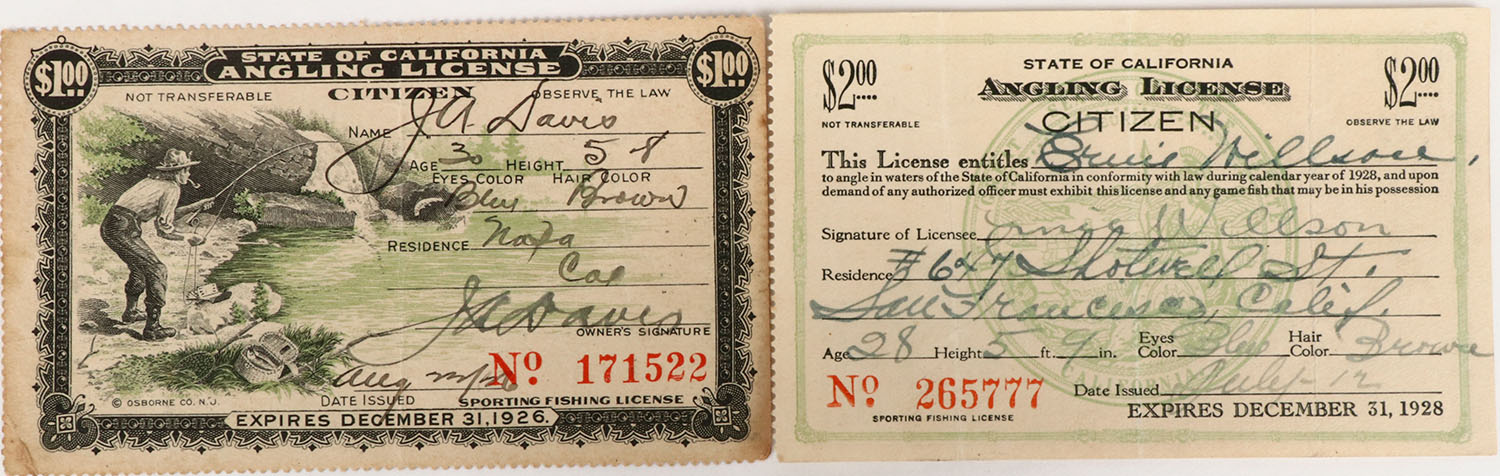 Lot of two RARE and EARLY California Fishing License, 1926 & 1928, great background graphics. Grade: Excellent - Value: 2 to 80
