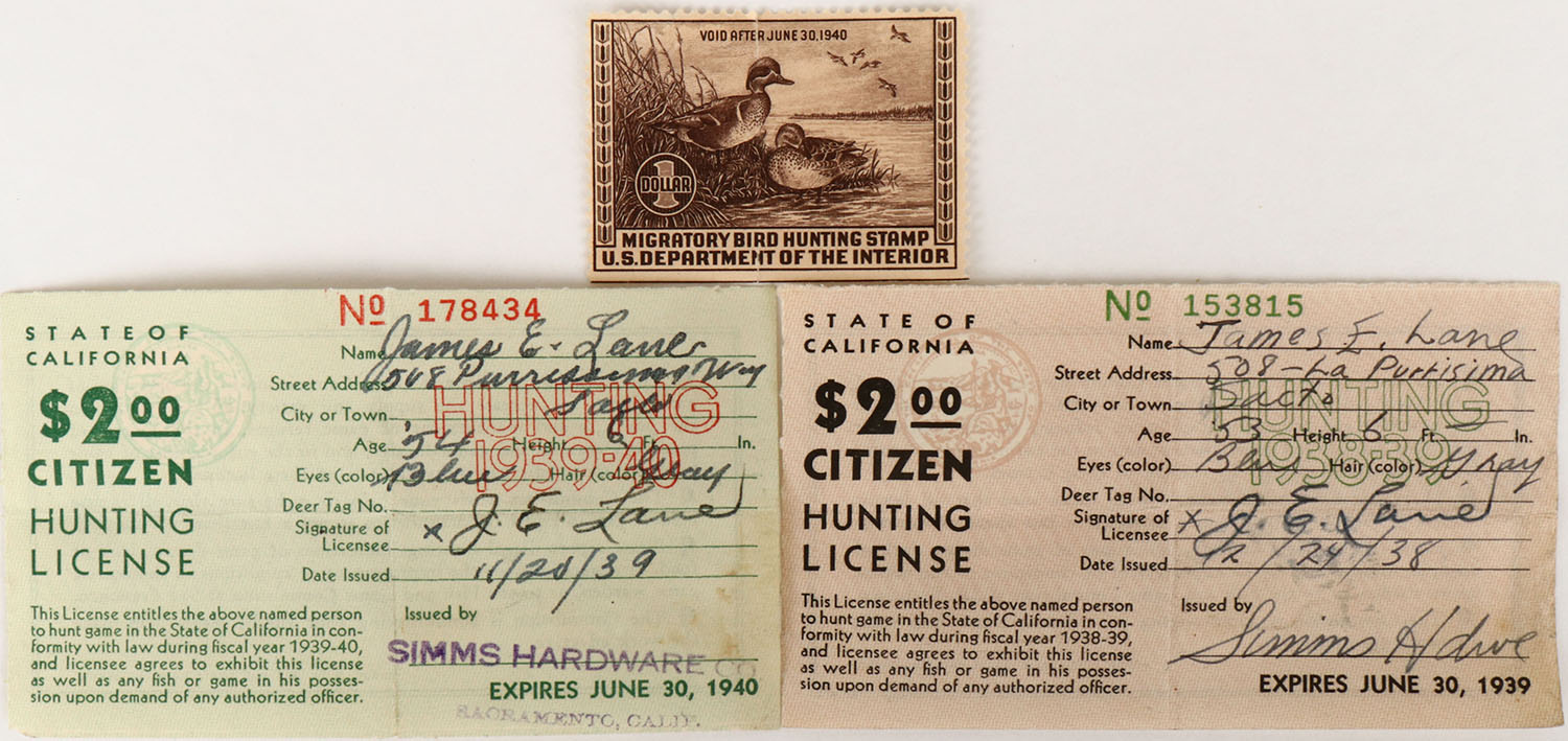 Lot of 2 RARE and EARLY California Hunting License, 1939/1940. Grade: Excellent - Value: 2 to 60