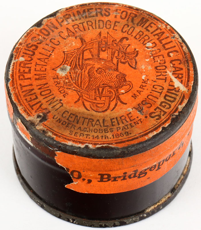 Early UMC early dog head logo percussion caps, 250 count, Full & Sealed, has some age soiling. Grade: Very Good ++ - Value: 40 to 200