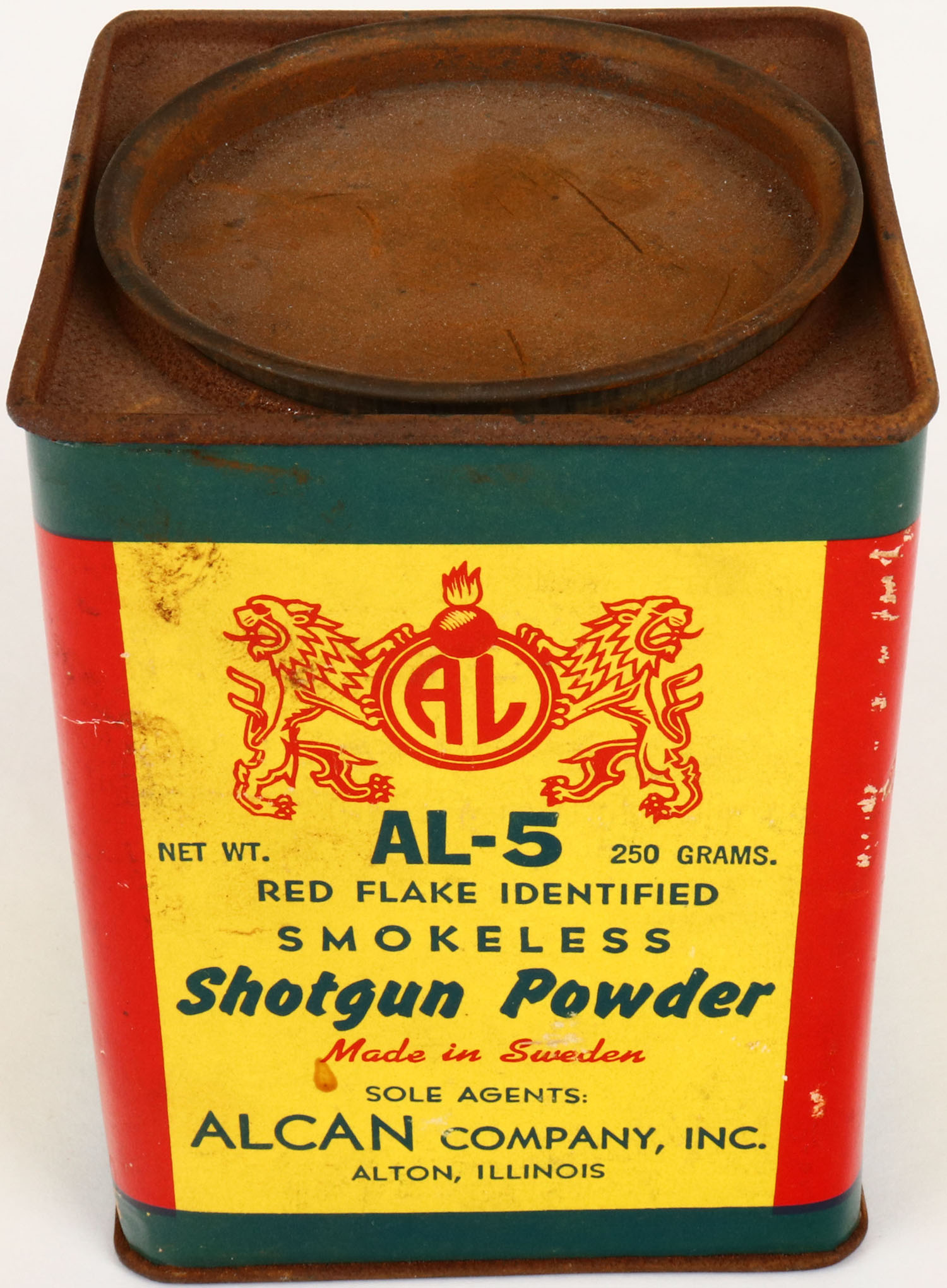 Alcan Shotgun Powder tin, Empty, great color to label on all 4 sides, some rust to top. Grade: Excellent + - Value: 2 to 30