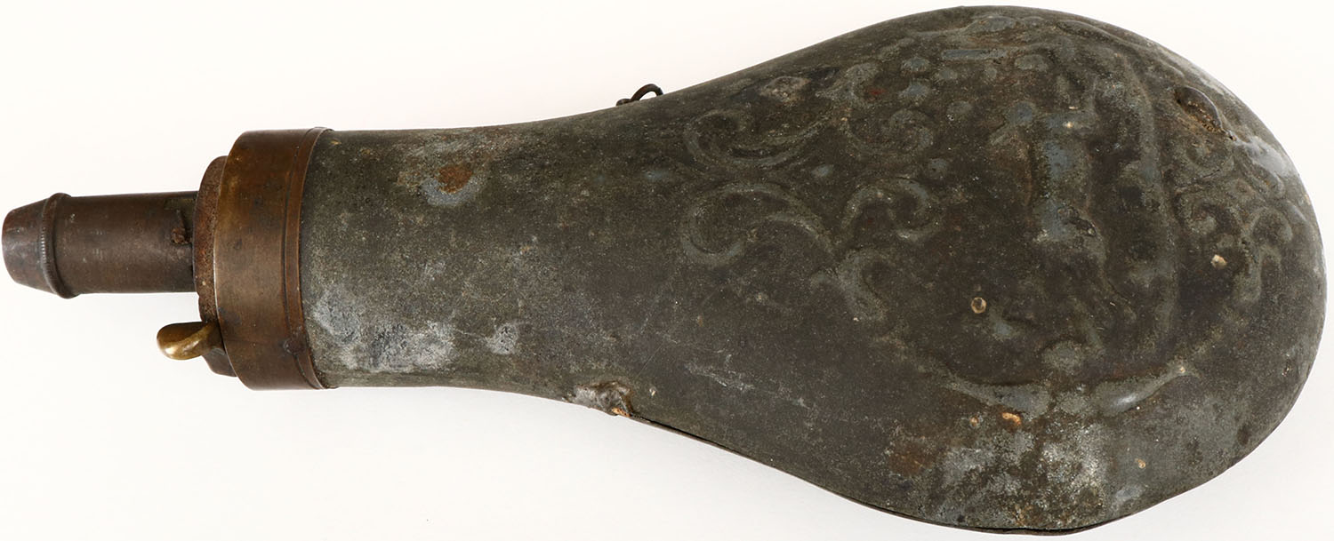 Small Metal powder flask, design is hard to see, has lots of age soiling. Grade: Good ++ - Value: 6 to 60