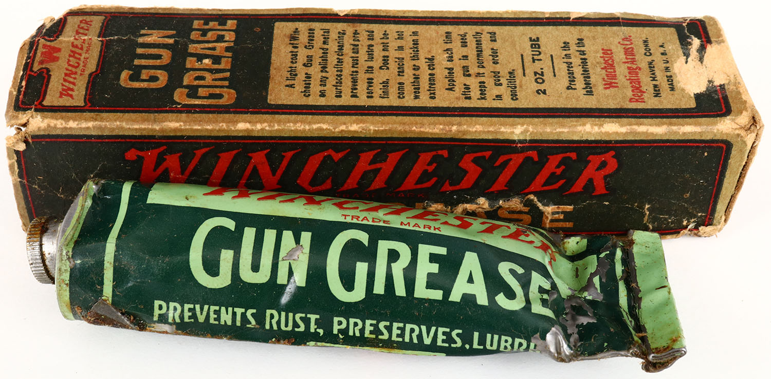Winchester Gun Grease tube, in original box, tube has scuffing with some use and box has lots of age soiling and scuffing. Grade: Very Good - Value: 30 to 80