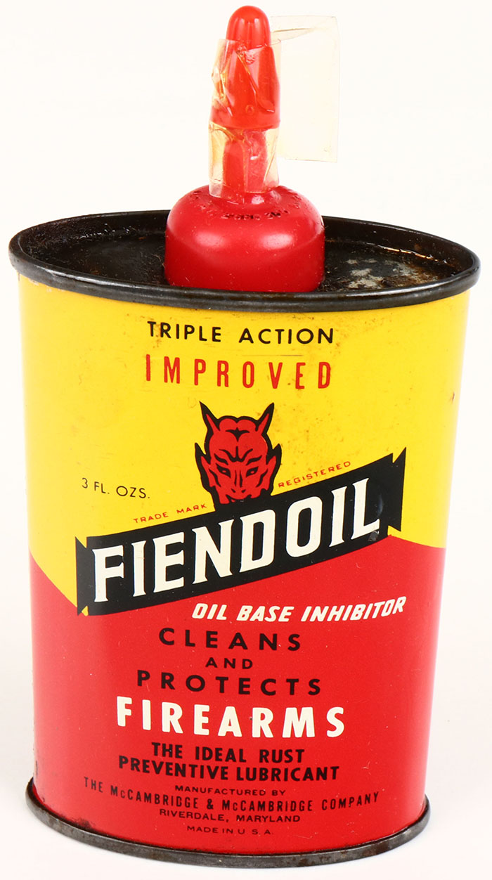 Fiendoil Oil Tin, plastic spout & plastic cap, Partial, solid with some age soiling. Grade: Excellent - Value: 30 to 90