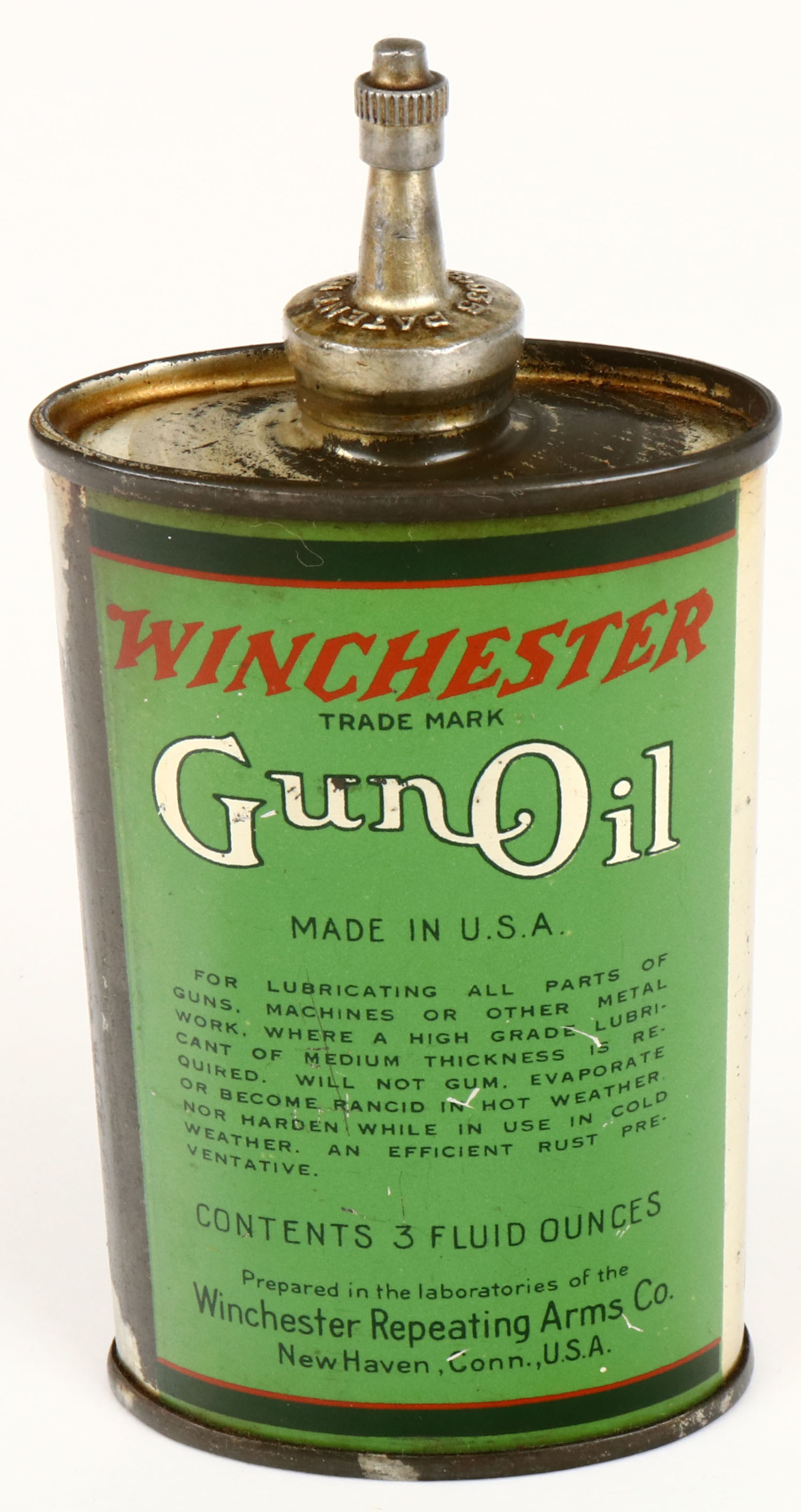 Winchester Oil Tin, Gun Oil with lead spout & lead cap, Empty , solid with some age soiling. Grade: Excellent - Value: 200 to 400