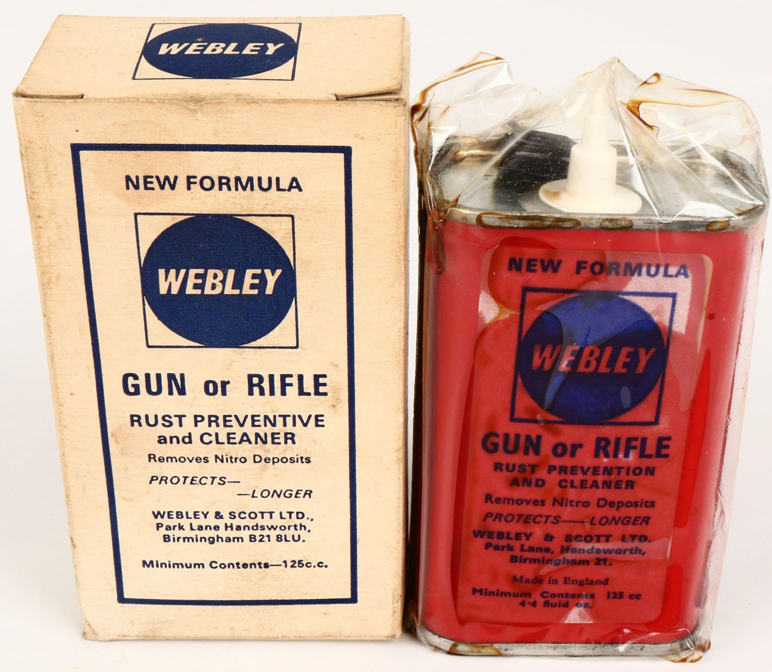 Webley oil tin, has cap, Full, in orignal box, some has leaked out. Grade: Excellent - Value: 20 to 80
