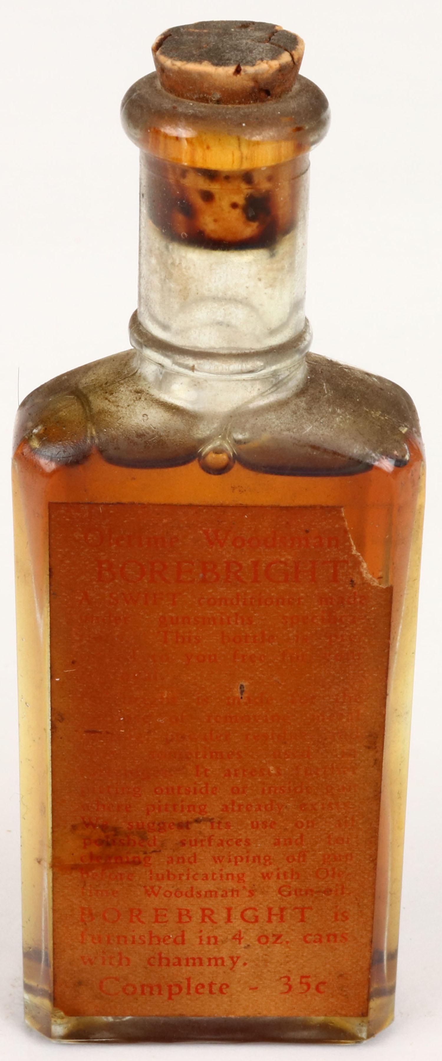Borebright glass oil jar, has cork cap, Full, some has leaked out and soaked label. Grade: Good ++ - Value: 10 to 50