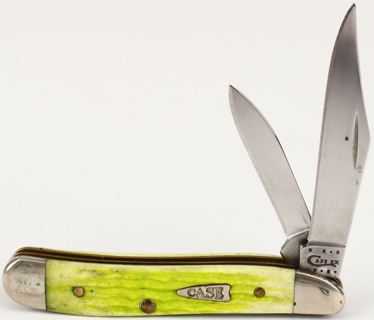Small Case knife, 6220 SS marked on blade, green celluloid grip, 2 blades, 2'' longest blade, blade is bright and clean. Grade: Excellent - Value: 40 to 200