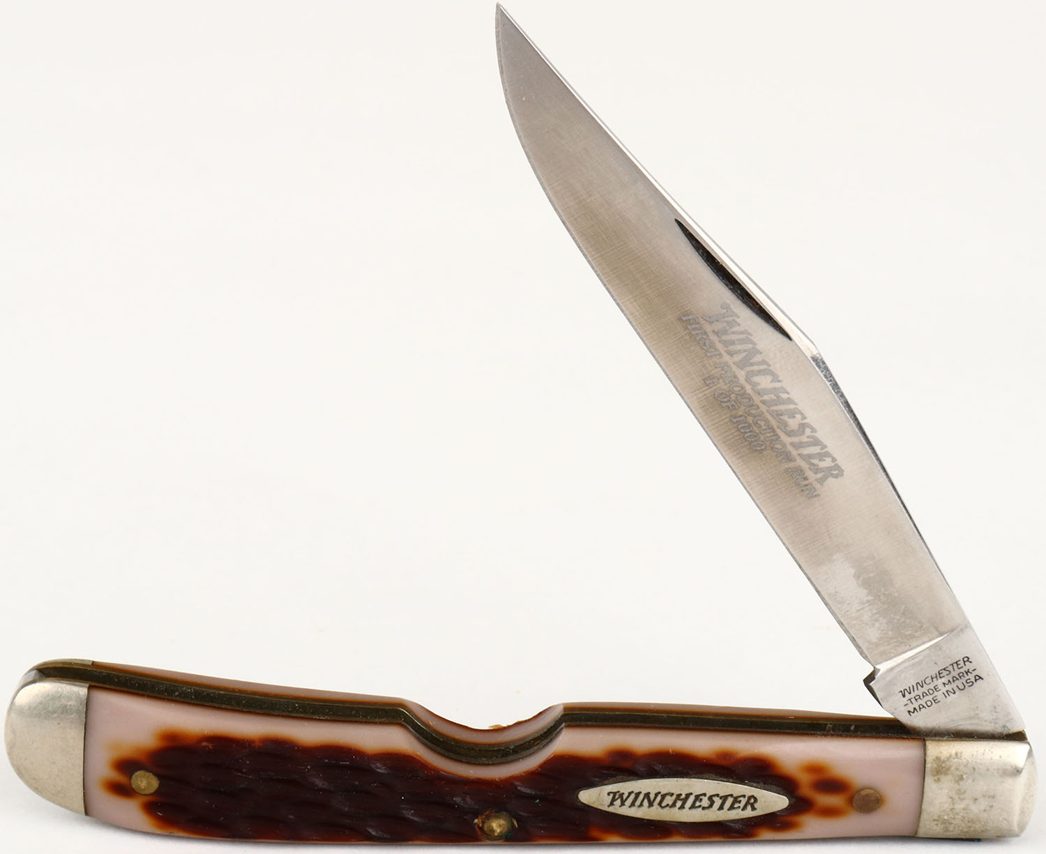 Winchester knife, 19004 on blade, EZ Open knife, celluloid grip, 1 blade is 3'', blade is bright and clean. Grade: Excellent - Value: 40 to 100