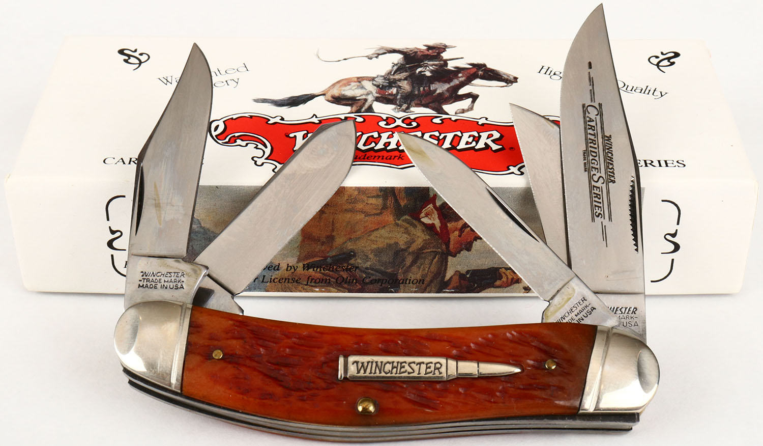 Winchester folding knife, in original box, W18 59117, burnt orange bone handle. Grade: MINT - Value: 40 to 100