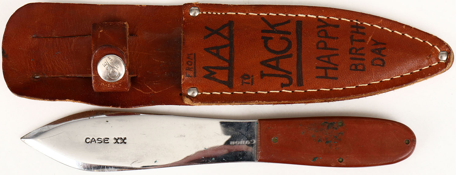 Case throwing knife with original leather sheath, 4 1/2'' blade, handle has age soiling, blade has scuffing, sharpie on sheath. Grade: Very Good - Value: 30 to 90
