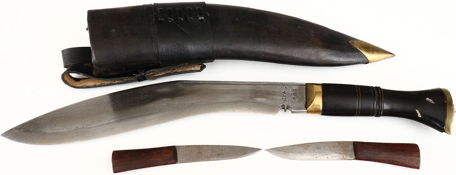 Large foreign Kukri knife, marked Nepal 1996 on blade, 11'' blade, blade shows some sharpening, still solid, has leather sheath and 2 small knives. Grade: Very Good - Value: 20 to 100
