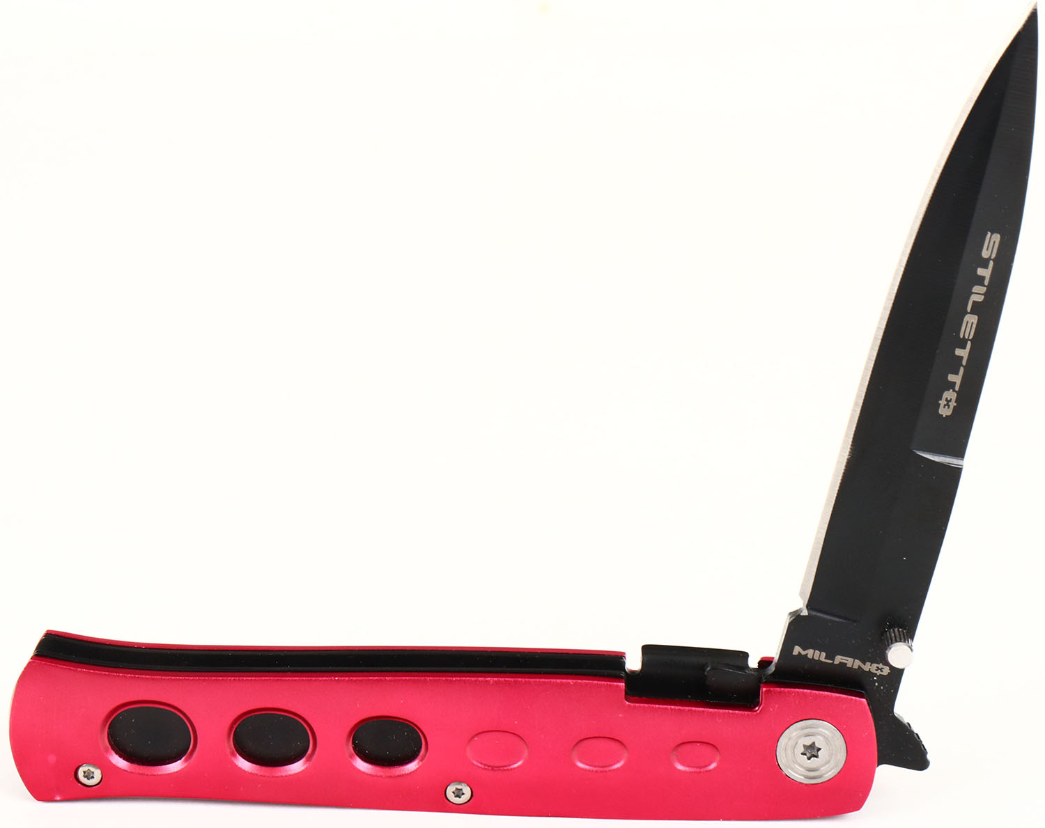 Milano Stiletto Folding knife with red handle, blade is spring assisted and snaps open. Grade: Excellent ++ - Value: 10 to 50