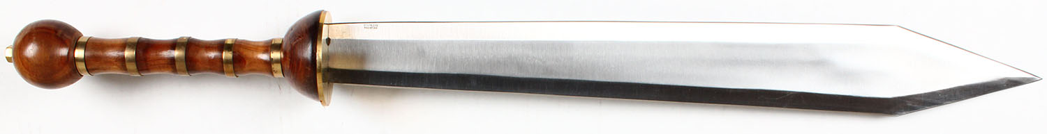 Large Modern made Roman sword, Pakistan on blade, 23'' blade, handle is wood and brass, blade is bright and clean. Grade: Excellent ++ - Value: 50 to 250