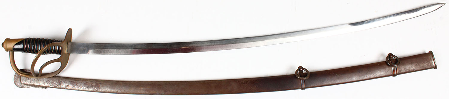 Large Sword, marked on blade: '' Made in Spain TOLEDO'', 34'' blade, hand guard with leather grip and has metal sheath, blade has age soiling . Grade: Very Good - Value: 40 to 150