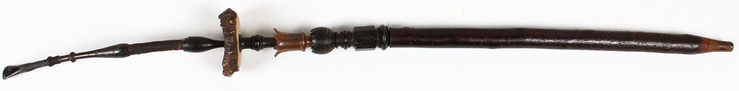 Early American Indian pipe, 33'' OAL, has repair to leather at top, well made, very neat. Grade: Very Good - Value: 50 to 200