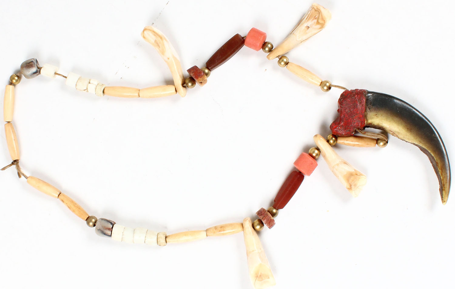 Early trade necklace, brass, glass, stone, bone beads, 4'' bear, claw, teeth. Grade: Excellent - Value: 200 to 600